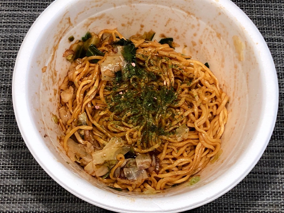 最近出てるノンフライ麺のカップ麺には「そのまま店で出せるんじゃ」と思えるレベルのものもあるけど、カップ焼きそばに限ってはフライ麺のほうが合うのかもしれない。予想外の結果。実に勉強になる一品でした。