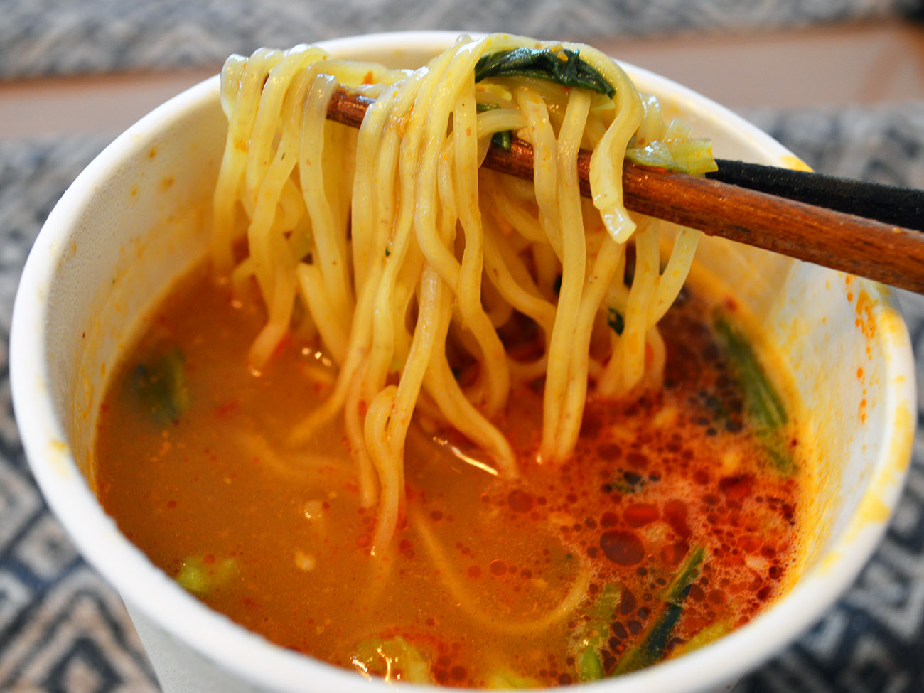 かやくもいわゆる謎肉っぽいものが存在感を発揮してるし、伏兵かと思ってたチンゲン菜までもがウマくてびっくり。サイズは小さいのに食感がシャキシャキで、このカップ麺のなかで必要不可欠な存在になってる!
