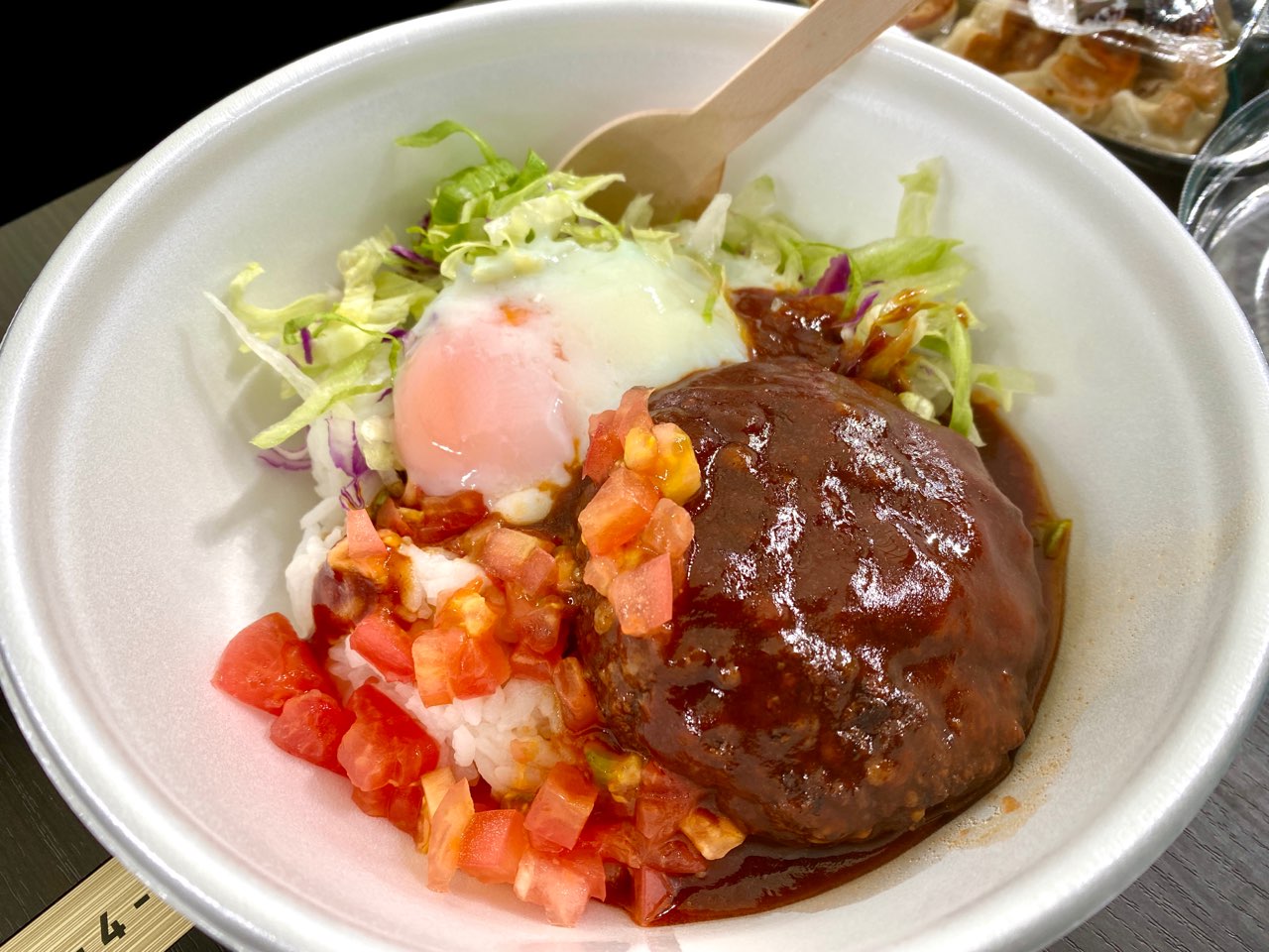 悩んだ末に今回食べたのは「リトル沖縄」の「あぐー豚のハンバーグ丼」。ボリュームもあるし、ハンバーグもうまい!