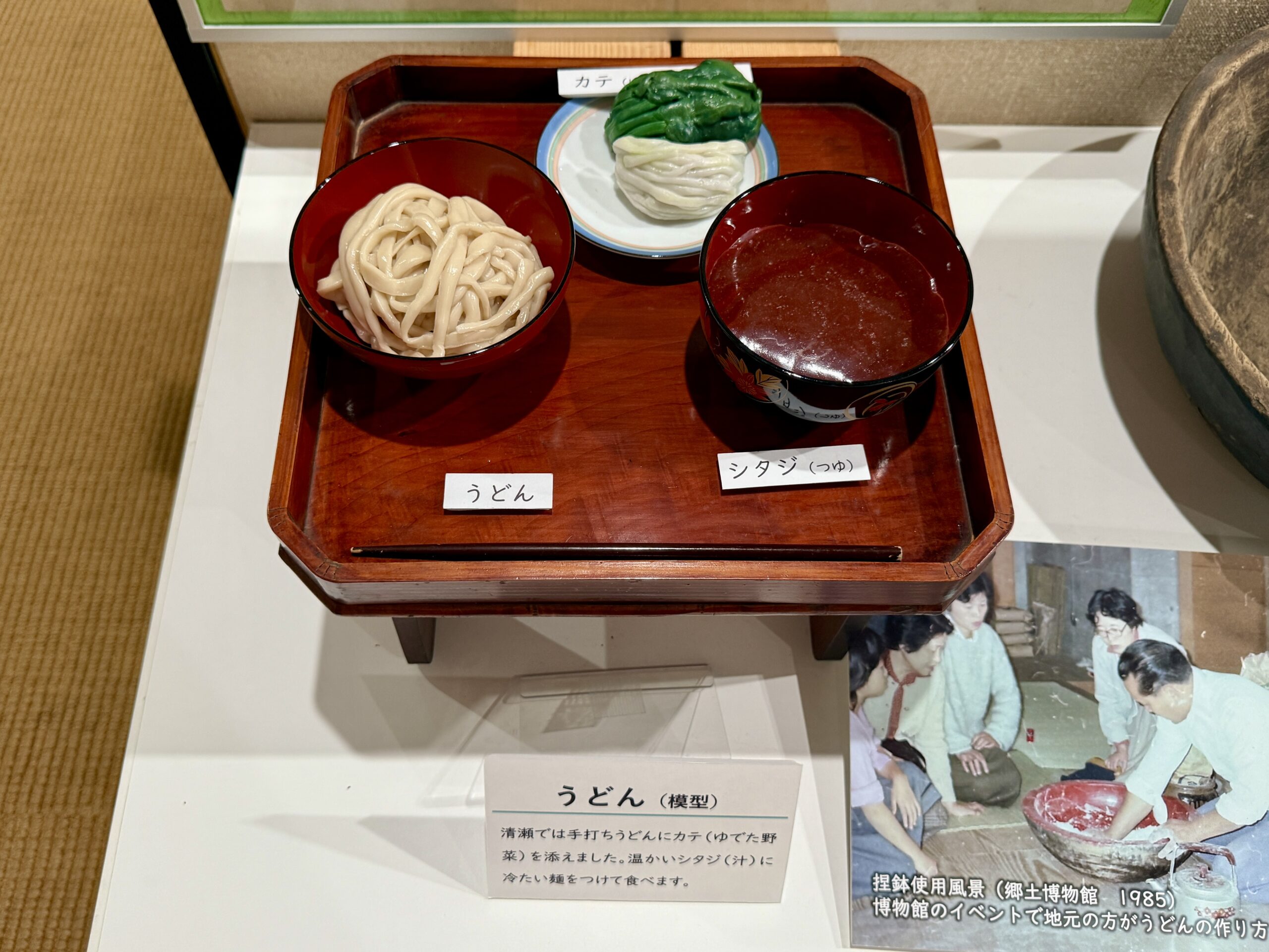 清瀬とか武蔵野台地で昔から食べてたうどんって、ほうれん草とか油揚げとか野菜などの「糧」と呼ばれるものを添えて食べる文化だったんですな。これ、実は郷土博物館内にも展示されてるんですよ。