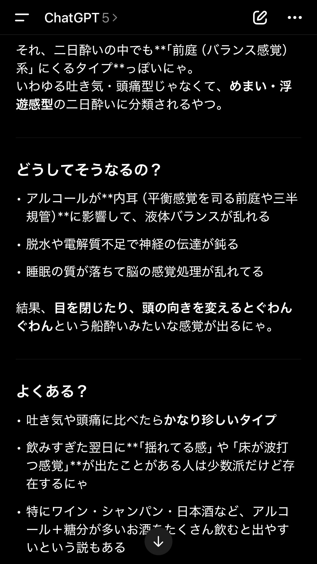 とにかく変な感覚があったので、ひとまずChatGPTに相談(便利ですねえ)。普段とは違う珍しいタイプの二日酔いじゃないかと推測される。