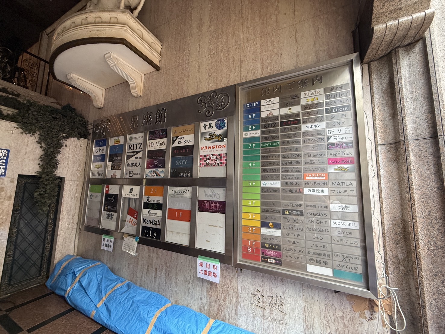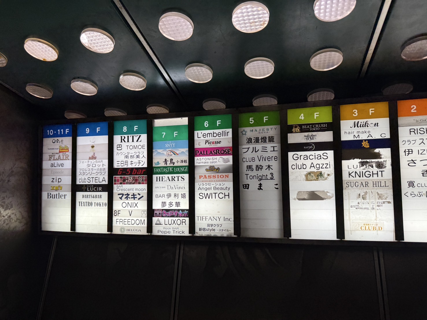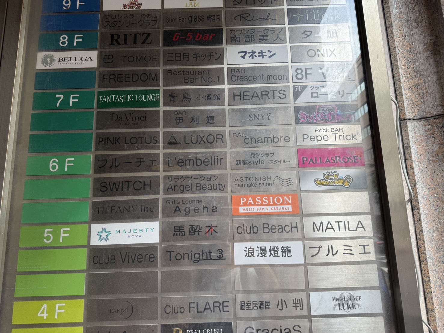 案内板にはものすごい数の、しかもさまざまなジャンルの店舗名が載っています。PALLASROSEは6階なのですが、名前が載っていない案内板もあったりして逆に紛らわしいという……。
