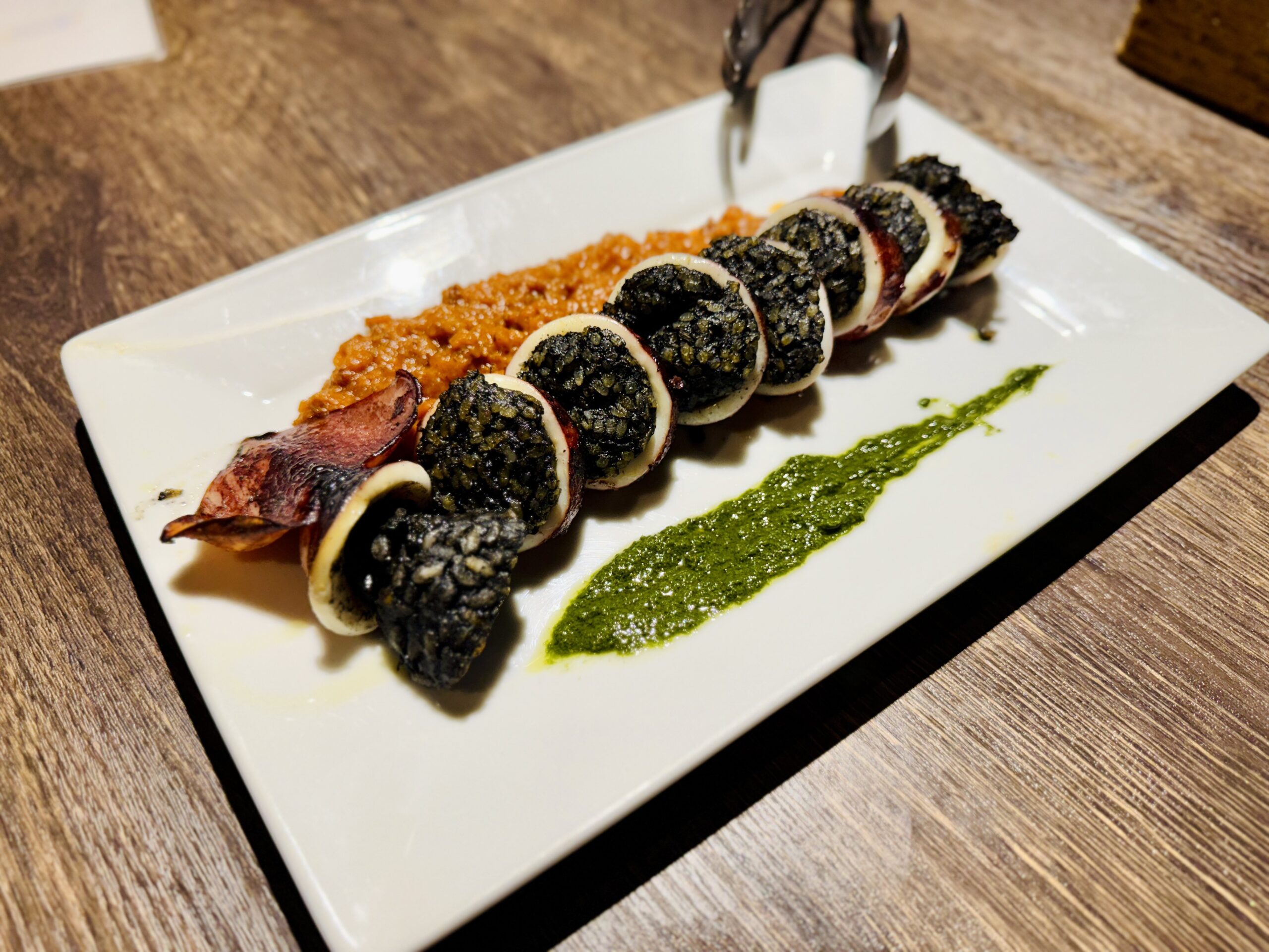 イカスミ味のライスをイカに詰め込み、イカの肉を使ったトマトソースとバジルソースでいただきます。ソースもシャレてるけど、イカ自体が柔らかくて最高にうまいし、ライスの味付けも最高!